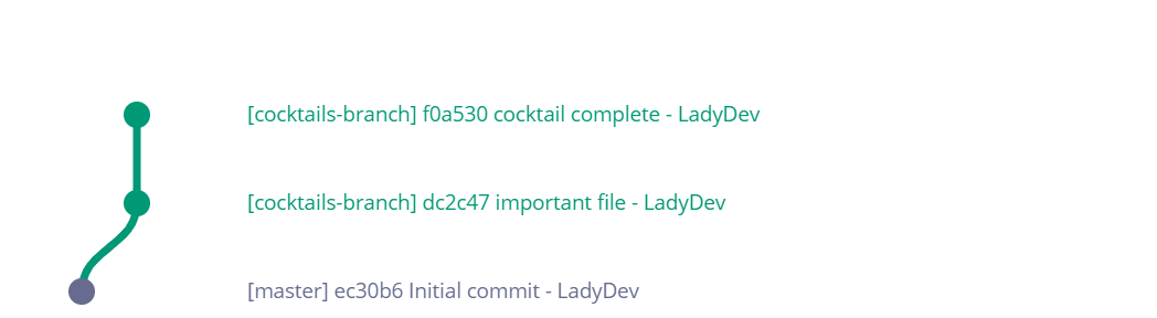 git log --graph. You should see your change on 'cocktails-branch' and the second commit from the top is where 'master' is. You diverged from 'master'. Your git graph looks like this