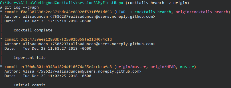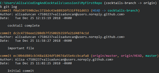 (HEAD -> cocktails-branch). This says your own local copy of the "cocktails-branch" branch is at the top commit. Notice the bottom commit has(origin/master, origin/HEAD). This is the last change that your remote, GitHub, is aware of. Your terminal may not show where HEAD is.Your terminal automatically shows the output using 'less'. To exit out of 'less' type